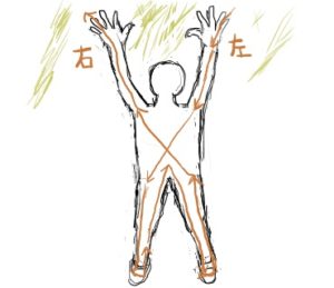 感じた熱を左手から左肩に、左肩から右足の付け根に、右足の外側を通って右足の裏に、右足の裏から右足の内側を通ってヘソの下辺りに、ヘソの下辺りから左足の内側を通って左足の足裏に、左足の足裏から左足の外側を通って左足の付け根に、左足の付け根から右肩へ、右肩から右の手のひらへ行って熱を外に出すイメージをします。