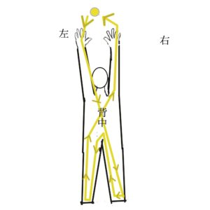 両手を上にかざして両手の間に月が来るように視点を置きます。そこからは前回と同じで左手から月の気を吸収して8の字を描くようにして右手から空に気を返します